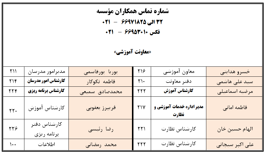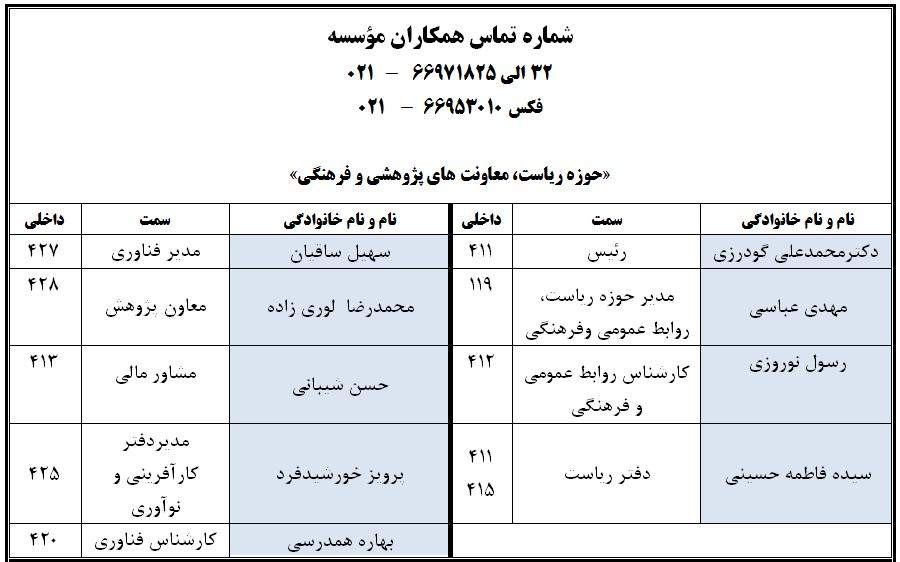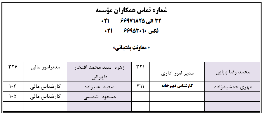 تماس با ما ارسال به دیگران نام شما ایمیل شما ایمیل دریافتکننده ارسال انصراف نشانی: تهران، خیابان انقلاب اسلامی، خیابان وصال شیرازی، کوچه دکتر باستانی پاریزی (فر دانش) شماره 8 تلفن: 88983439 (021) نمابر: 88962042 (021)